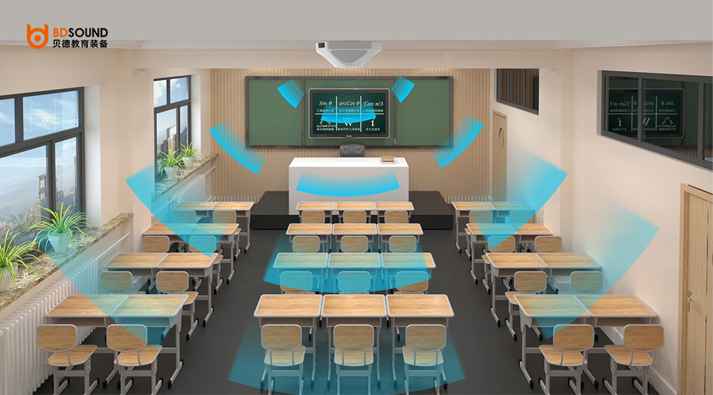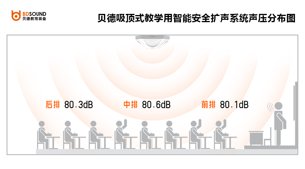 ● 均勻的聲場(chǎng)分布:聲頻360°等聲壓均勻覆蓋每個(gè)角落教室內(nèi)各個(gè)位置的聲壓差值在4dB以內(nèi);